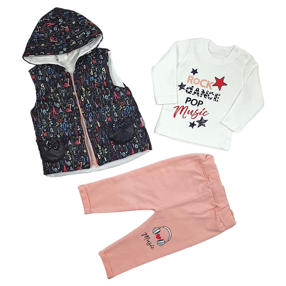 ست 3 تکه بلوز آستین بلند پافر و شلوار نوزاد دخترانه گلبهی Vital