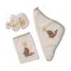 این ست شامل حوله تن پوش، حوله دورپیچ کلاه دار، لیف و یک جفت پاپوش نوزادی است.