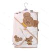 این ست شامل حوله تن پوش، حوله دورپیچ کلاه دار، لیف و یک جفت پاپوش نوزادی است.
