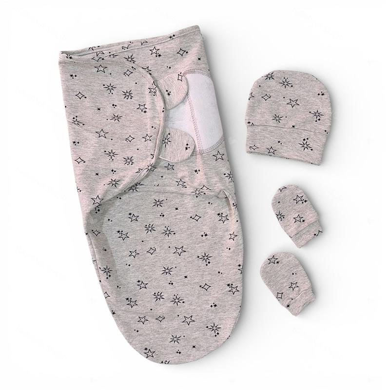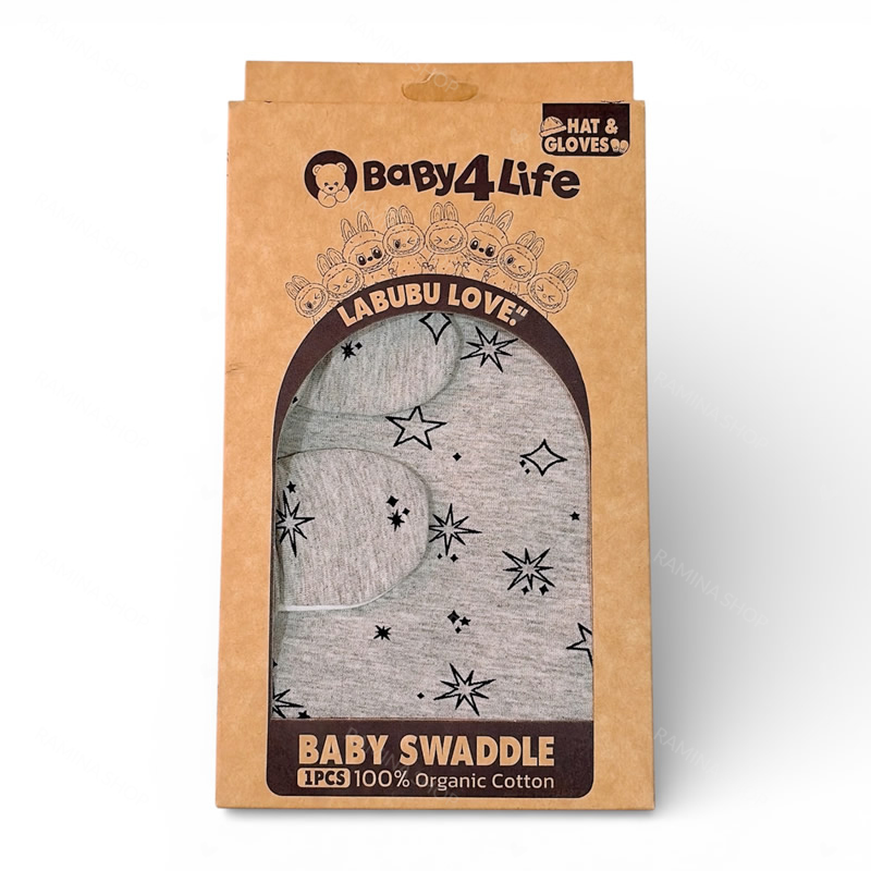 ست قنداق، کلاه و دستکش نوزاد سری لبوبو طرح ستاره طوسی بیبی فورلایف Baby4life آرامش و راحتی را برای نوزاد به ارمغان می آورد.