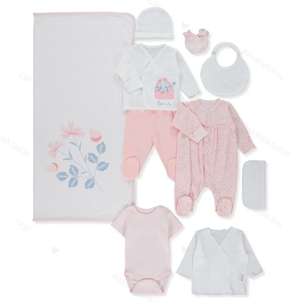 این ست شامل سرهمی جوراب دار، بادی آستین کوتاه، شلوار جورابی، مانتو، کلاه، پیشبند، دستکش، روپوش، دستمال و یک پتوی نخی دورپیچ نوزاد است.