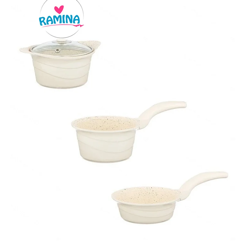 سرویس قابلمه گرانیتی نوزاد دیاکو عروس جنس گرانیتی 4 پارچه رنگ کرم با روکش گرانیتی و مقاوم.