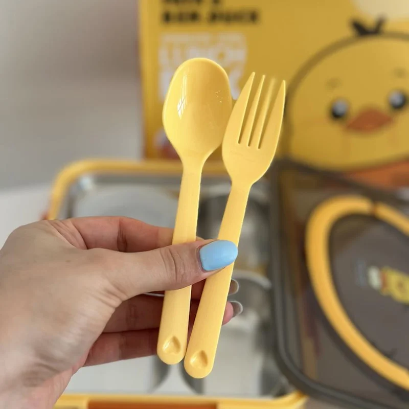 لانچ باکس دارای یک ست قاشق و چنگال پلاستیکی است.