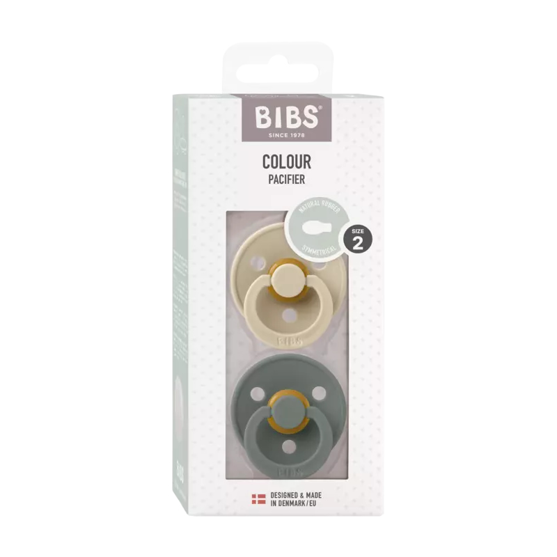 پستانک لاتکس سر بادامی نوزاد 6 تا 18 ماه بیبس Bibs مدل COLOUR سبز و کرم مناسب برای نوزادان بالای شش ماه است.